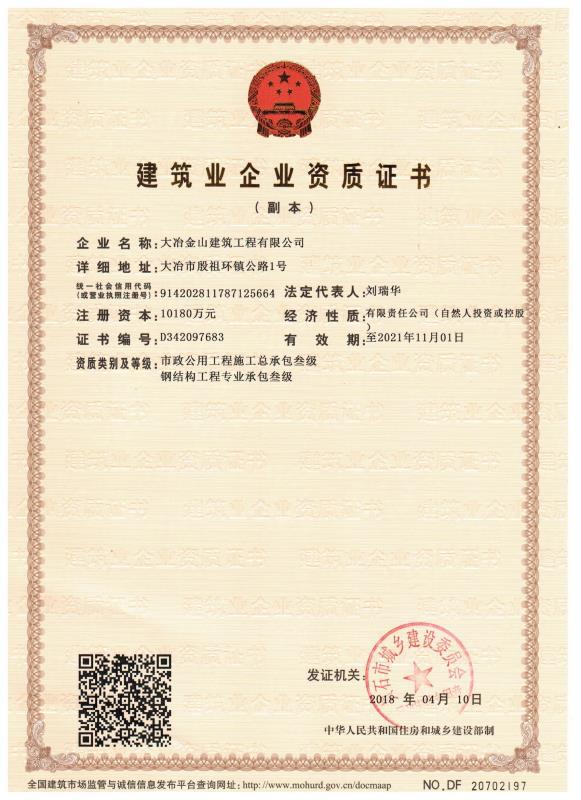大冶金山建筑工程有限公司始建于1984年,屬鎮(zhèn)辦集體企業(yè)。1997年改制為大冶山建筑工程有限責(zé)任公司,屬股份制企業(yè)。2013年更名為大冶金山建筑工程有限公司,2018年3月公司資源重組,公司注冊(cè)資金達(dá)到10180.00萬(wàn)元,公司法定代表人為劉瑞華。公司具有古建筑工程專業(yè)承包壹級(jí)、建筑工程施工總承包貳級(jí)、市政工程總承包叁級(jí)、鋼結(jié)構(gòu)工程專業(yè)承包叁級(jí)資質(zhì)。